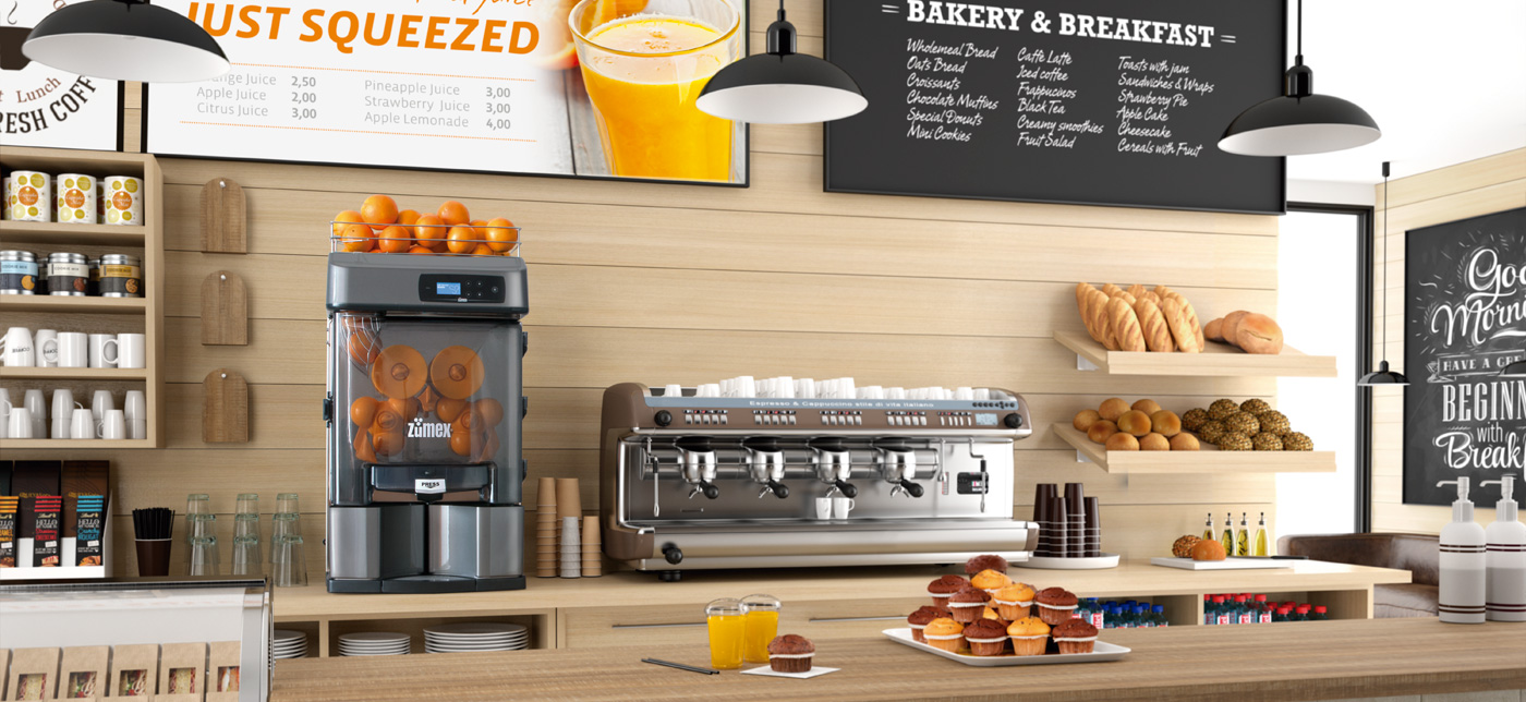 آبمیوه گیری زومکس Versatile pro از تولیدات پیشرفته ی کمپانی زومکس ایتالیا است که در گروه تجهیزات کافی شاپ ، رستوران ها و آبمیوه بستنی با حجم کاری بالا قرار می گیرد آمیوه گیری زومکس مدل از ساختار ظاهری زیبایی برخوردار است که به صورت رومیزی مورد استفاده قرار می گیرد . این محصول با به کارگیری فن آوری و تکنولوژی های جدید تولید گردیده است و قادر است در دو حالت اتوماتیک و سلف سرویس عمل نماید . دارا بودن صفحه نمایش لمسی علاوه بر زیبایی بخشیدن به دستگاه این امکان را به کاربر می دهد تا حالت آبمیوه گیری را به راحتی انتخاب نماید . آبمیوه گیری صنعتی معرفی شده قادر است 10 کیلوگرم پرتقال را در سبد خود جای دهد و در یک دقیقه 22 پرتقال را آبگیری نماید